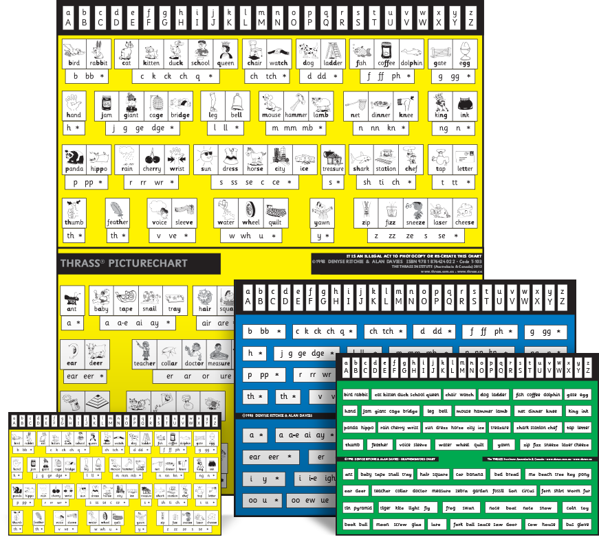 The THRASS Charts are designed to be a whole-picture multisensory teaching tool for accessing the 44 phonemes of spoken English and the 120 most common graphemes of written English. Various themes have been incorporated into the charts for use in teaching oral and written language skills and basic grammar skills.