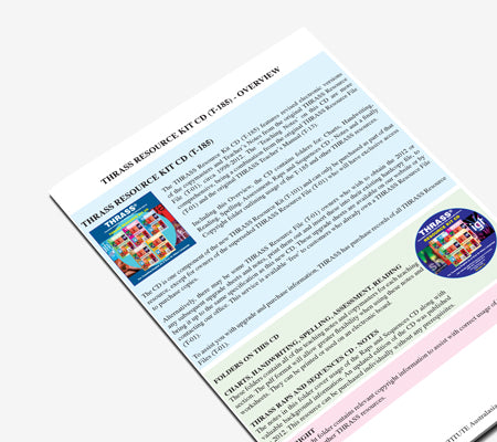 The majority of this copyright information is specific to items in the THRASS Resource Kit (T-101). There is also general information that applies to other THRASS resources. Owners of the now superseded THRASS Resource File (T-01), may obtain an updated copy of the copyright notice that applies to that resource by visiting our website. In all instances of uncertainty about copyright regarding any THRASS resources, please contact us for clarification. Also check the individual resource for any copyright information